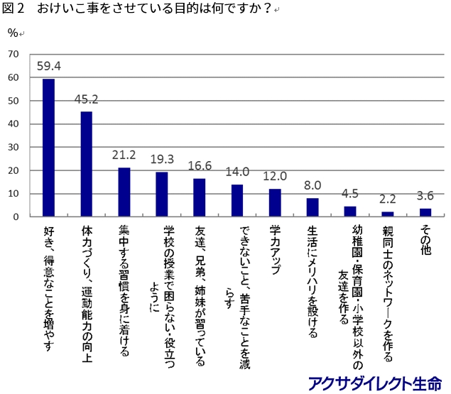 おけいこ事をさせている目的は、59.4%の「好き、得意なことを増やす」が1位となり、45.2%の「体力づくり、運動能力の向上」が2位となりました。⇒図2