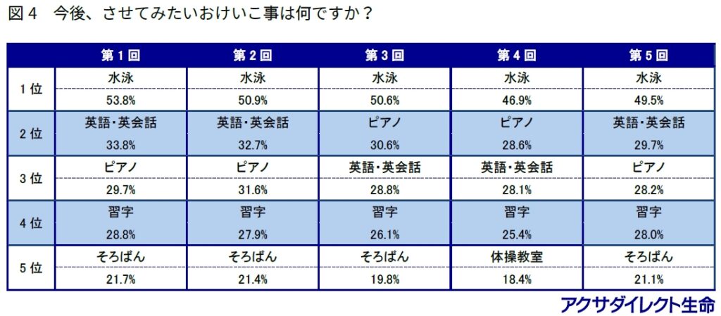 お子さまにさせているおけいこ事は、1位が37.0%の「水泳」、2位が15.5%の「英語・英会話」「ピアノ」でした。また、今後お子さまにさせてみたいと思うおけいこ事でも、1位が49.5%の「水泳」、2位が29.7%の「英語・英会話」、3位が28.2%の「ピアノ」となりました。「水泳」が依然人気なのに加えて、おけいこ事の実態と今後の意向に相違はありませんでした。⇒図3、図4