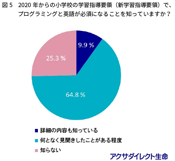 文部科学省が公示している、小学校の新学習指導要領として、2020年からプログラミングと英語が必須になることを知っていた母親は74.7%(詳細の内容も知っている、何となく見聞きしたことがある程度の合計)となりました。⇒図5