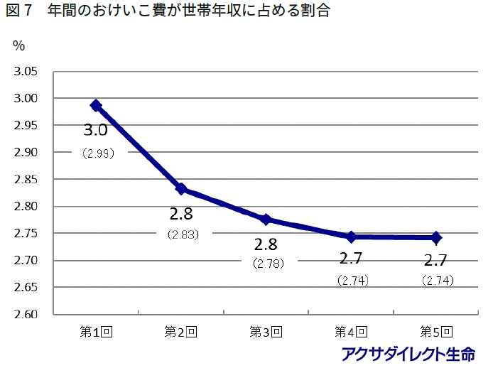 お子さまのおけいこ事にかかる平均費用は、年間で154,896円(*3)となり、世帯年収に占める割合は2.7%と、第1回の調査から2~3%の推移となっています。⇒図7