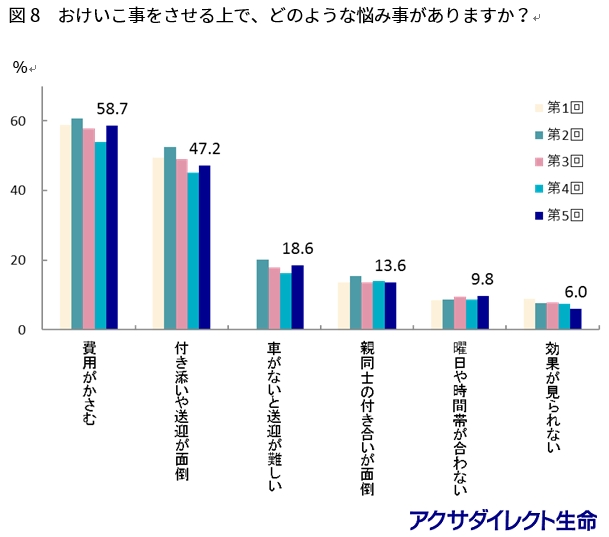 また、おけいこ事の目的は、子どもの「好き、得意なことを増やすため」としながらも、実際には小学校に入ってからの授業で差が明確になりやすい「水泳」「英語・英会話」などが人気となっていることから、おけいこ事選びの基準は必ずしも子どもの興味・関心ではなく、学校に入ってからの実利という、子どもを思う親の心が強く影響していることがうかがわれます。