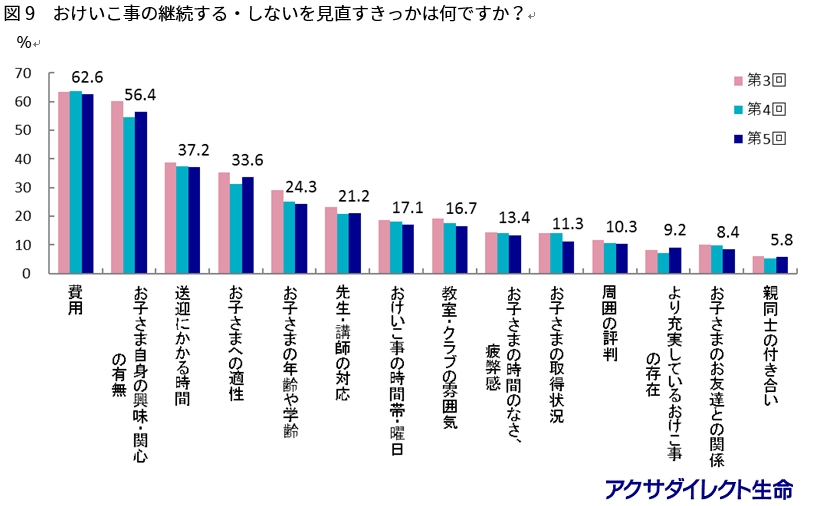 子どものおけいこ事に関する一番の悩みは、58.7%の「費用がかさむ」が依然として課題でした。また、おけいこ事を継続する・しないを見直しするきっかけとなるのも62.6%の「費用」が変わらず1位となりました。⇒図8、図9